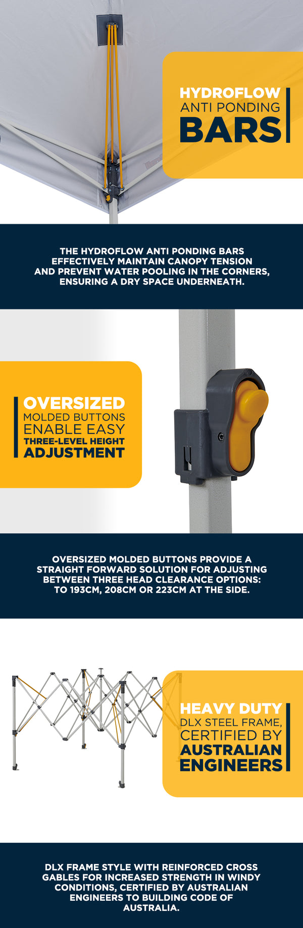 • Built for outdoor use, the Commercial Deluxe 3.0 Gazebo is a commercial gazebo 3x3 designed to handle sporting events, school events, yard sales, and other upcoming outdoor activities with ease. Its Hydro Flow Anti Ponding...