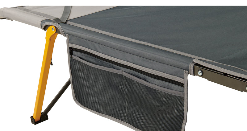 For added convenience, this camping stretcher includes a side organiser and gear loft, keeping essentials like your phone, flashlight, or gear within reach. The raised head section offers greater comfort, supporting a natural sleeping position. Whether you're setting up camp from your vehicle, pairing it with a swag, or looking for extra sleeping space at home, this camp stretcher is the perfect choice for effortless relaxation.