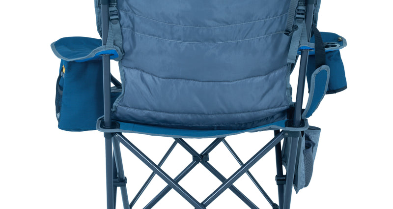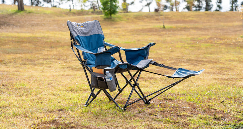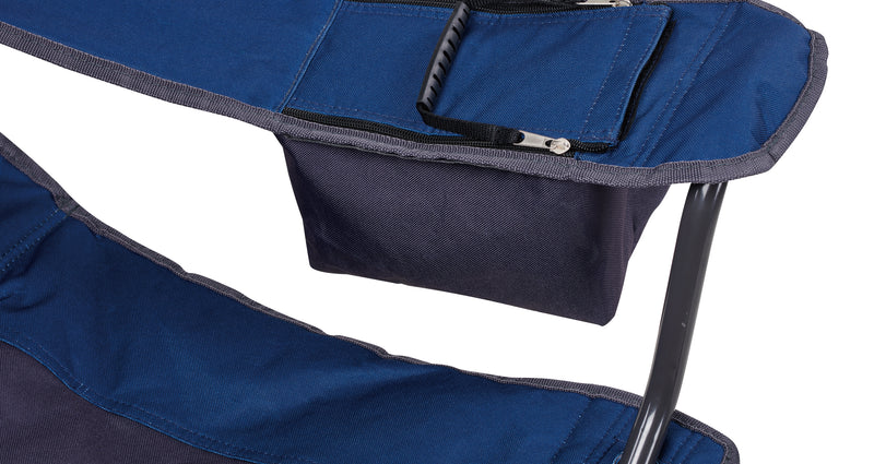 This deluxe reclining chair features a footrest for added comfort, a high padded back, and a durable steel frame. The deluxe side organiser and integrated side strap make it convenient for transport and storage.