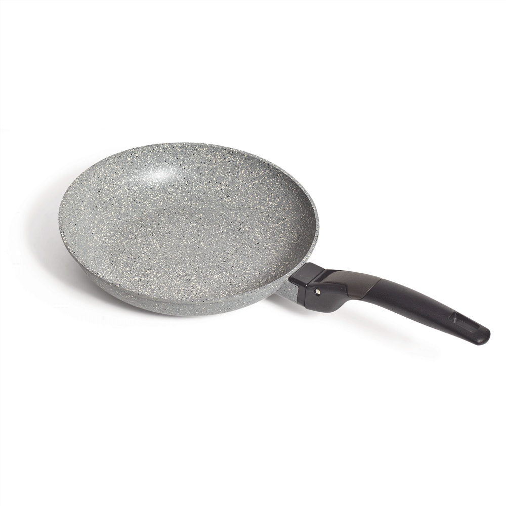 This 28cm frypan is made from lightweight diecast aluminium with a detachable handle, a triple-coated non-stick surface, and is compatible with induction cooktops. Oven-safe with the handle removed.