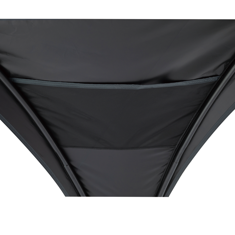 Internal storage pockets and attachable sunwall for privacy and protection.