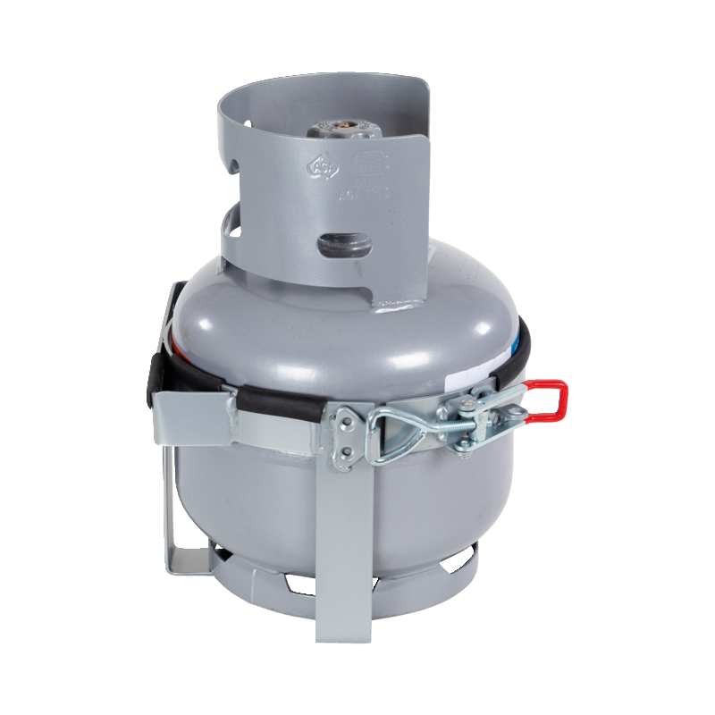 • This 4.5kg gas bottle holder is made from heavy-duty steel with a rubber-insulated trim to reduce vibrations. It is adjustable, lockable, and designed for durability, making it ideal for travel.