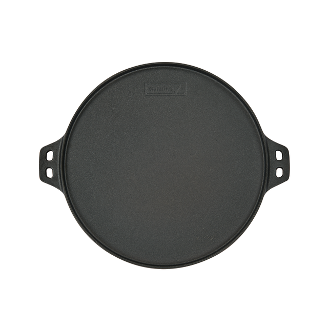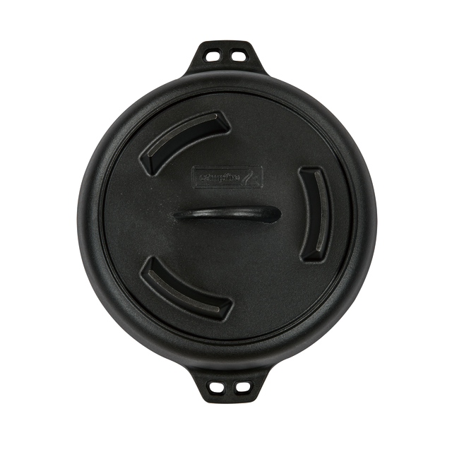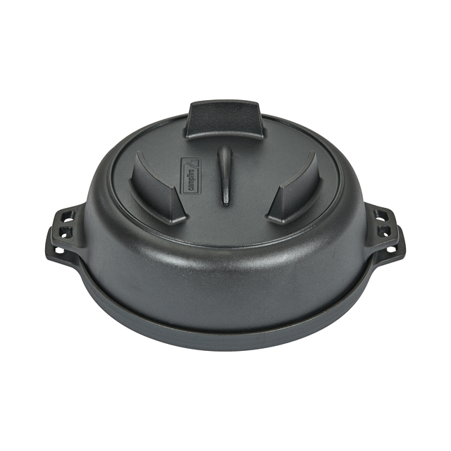 The 5-in-1 Camp Oven, made from heavy-duty cast iron, offers versatility with its ability to function as a grill, flat plate, wok, camp oven, or pizza oven. Pre-seasoned and ready for campfire cooking.