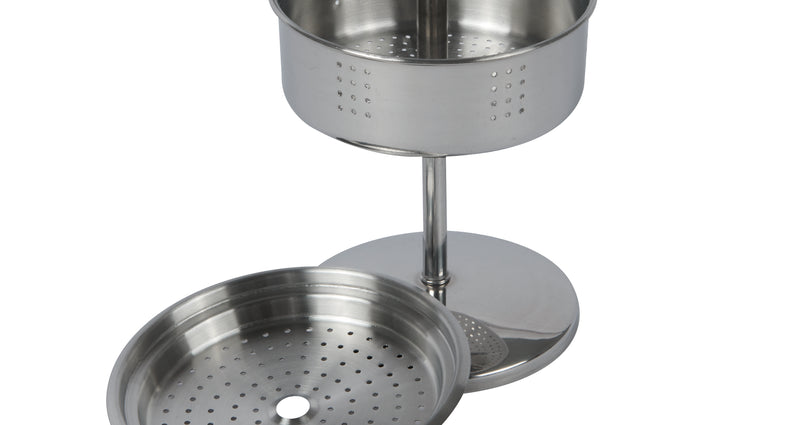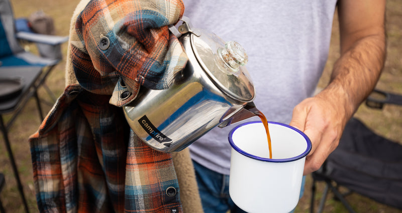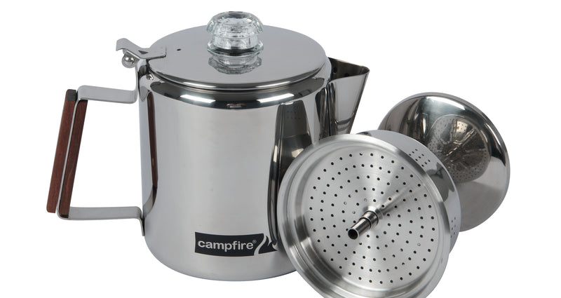 This stainless steel coffee percolator has a 5-cup capacity, featuring seamless 304 stainless steel construction with a wooden handle and a glass viewing knob for a classic coffee brewing experience.