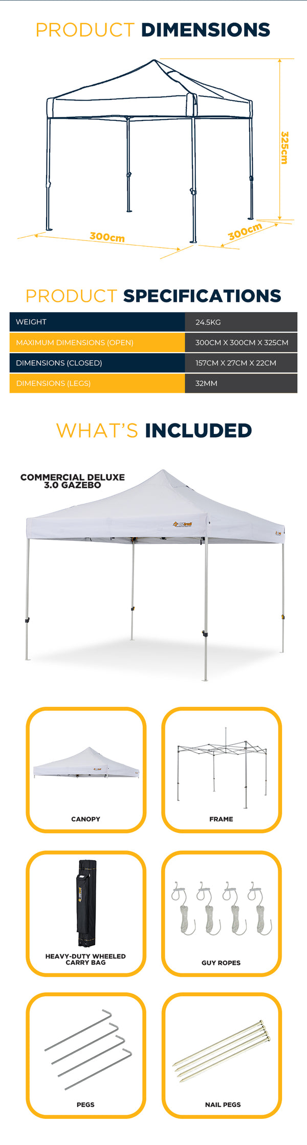 • Built for outdoor use, the Commercial Deluxe 3.0 Gazebo is a commercial gazebo 3x3 designed to handle sporting events, school events, yard sales, and other upcoming outdoor activities with ease. Its Hydro Flow Anti Ponding...
