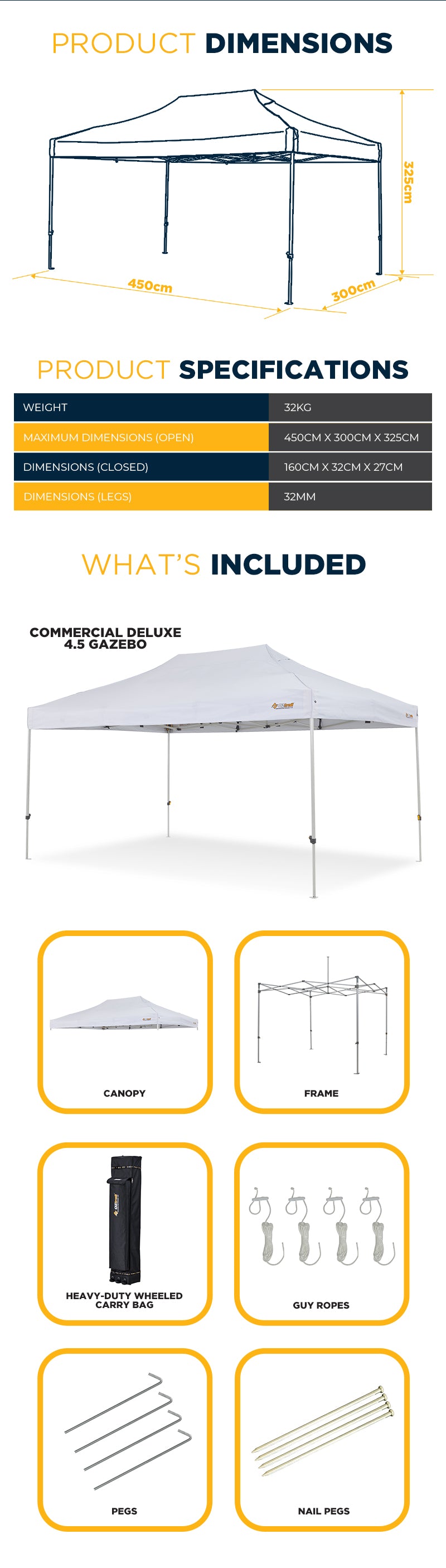 The Commercial Deluxe 4.5 White Gazebo is a great gazebo built for outdoor events, markets, and corporate gatherings. Its heavy-duty frame and sturdy design provide reliable shelter, while the Hydro Flow Anti Ponding Bars prevent...