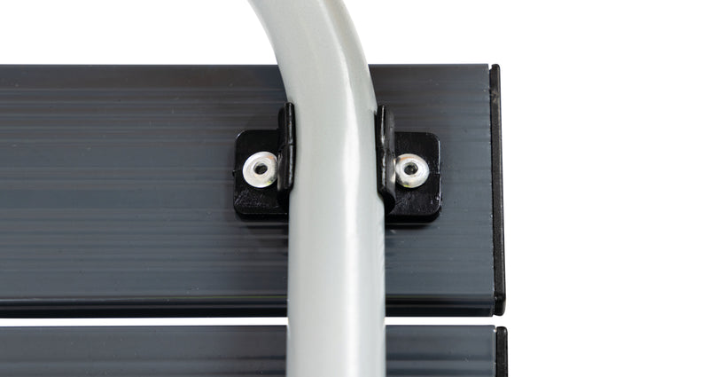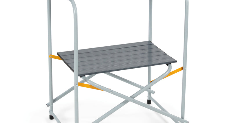 A lightweight and portable camp kitchen with a steel frame and aluminium slat top. It features a spacious benchtop for large stoves and includes a storage shelf for extra convenience. Quick to set up and pack down.