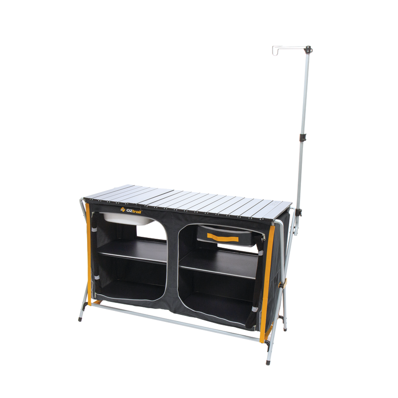 An all-in-one portable camp kitchen with an integrated sink, double cupboard, and a quick setup steel frame. The unit includes a lantern pole, towel rail, and mesh pockets for added storage, making it ideal for camping.