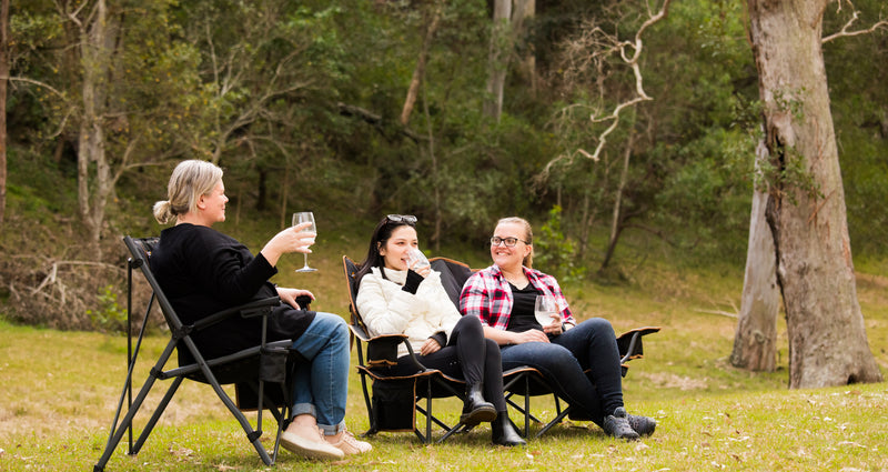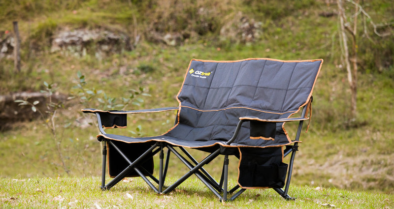 A wide, fully padded camping chair designed for two people, featuring dual insulated cup holders, side organisers, and a comfortable low seating position.