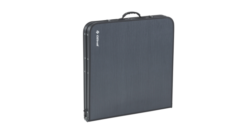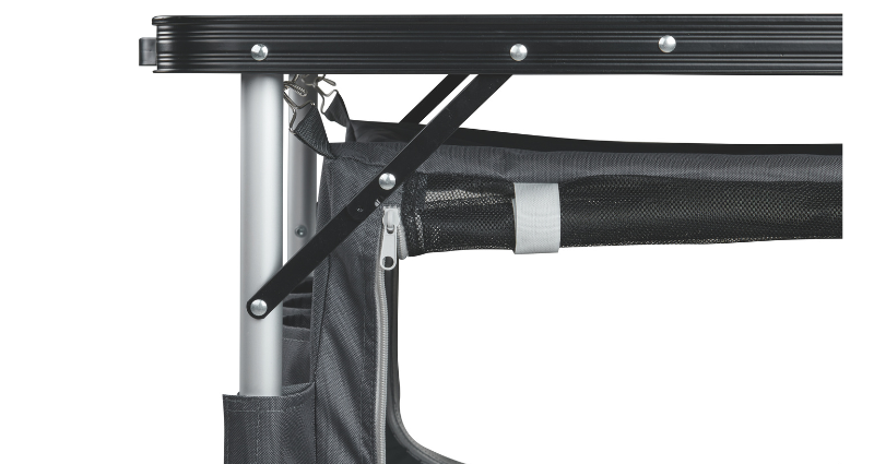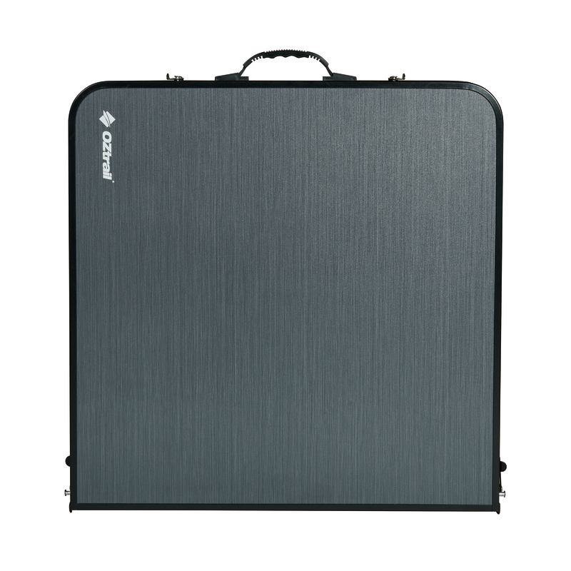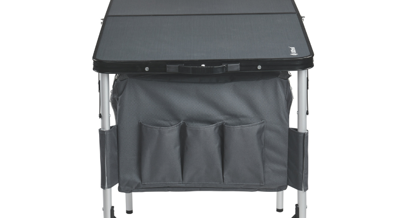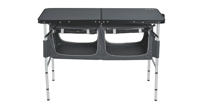 A sturdy, lightweight aluminium folding table with storage underneath. Ideal for camping trips, it includes a 600D fabric storage cupboard with MDF shelves for convenient organisation.