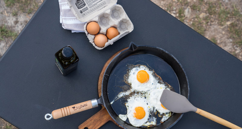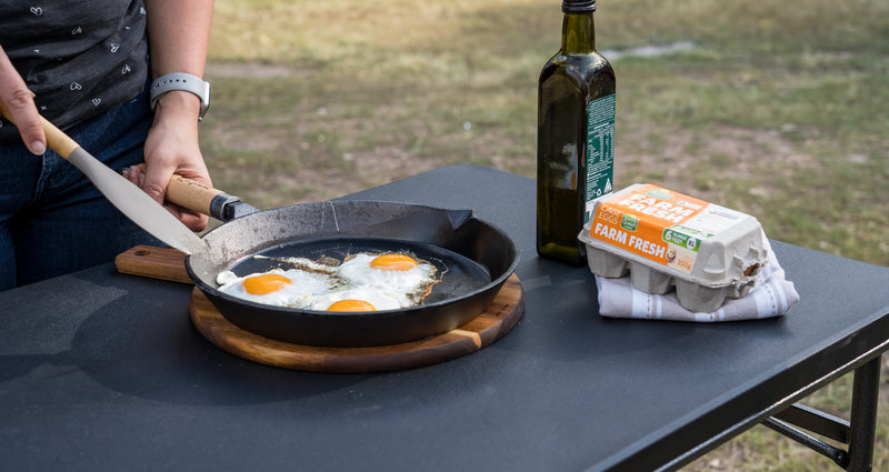 Compact folding table with adjustable height settings, perfect for dining or food prep during camping trips.