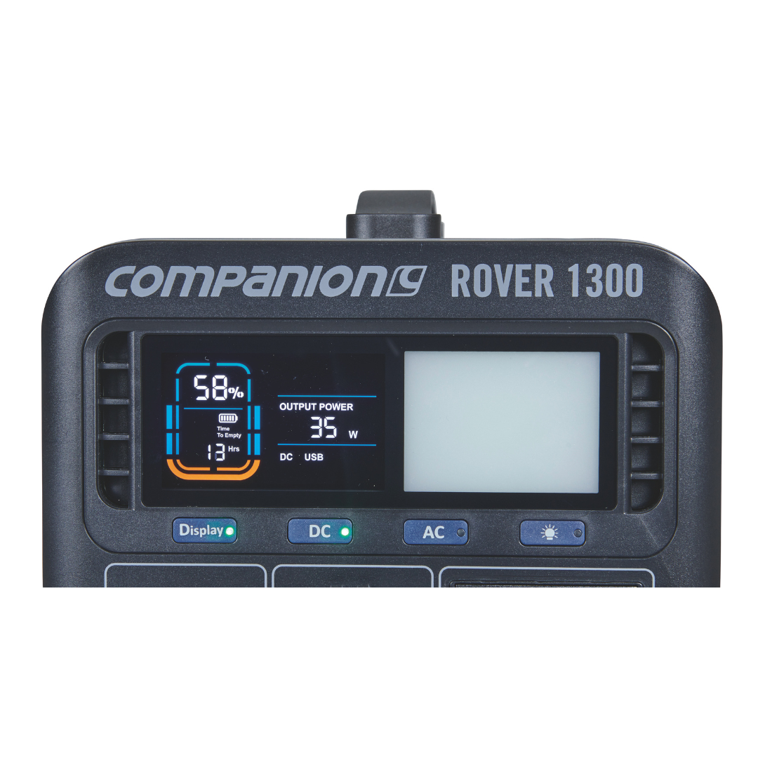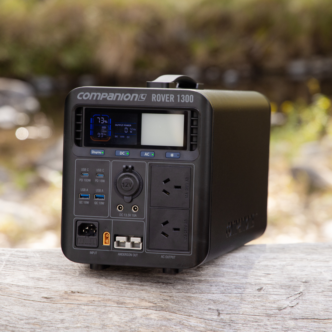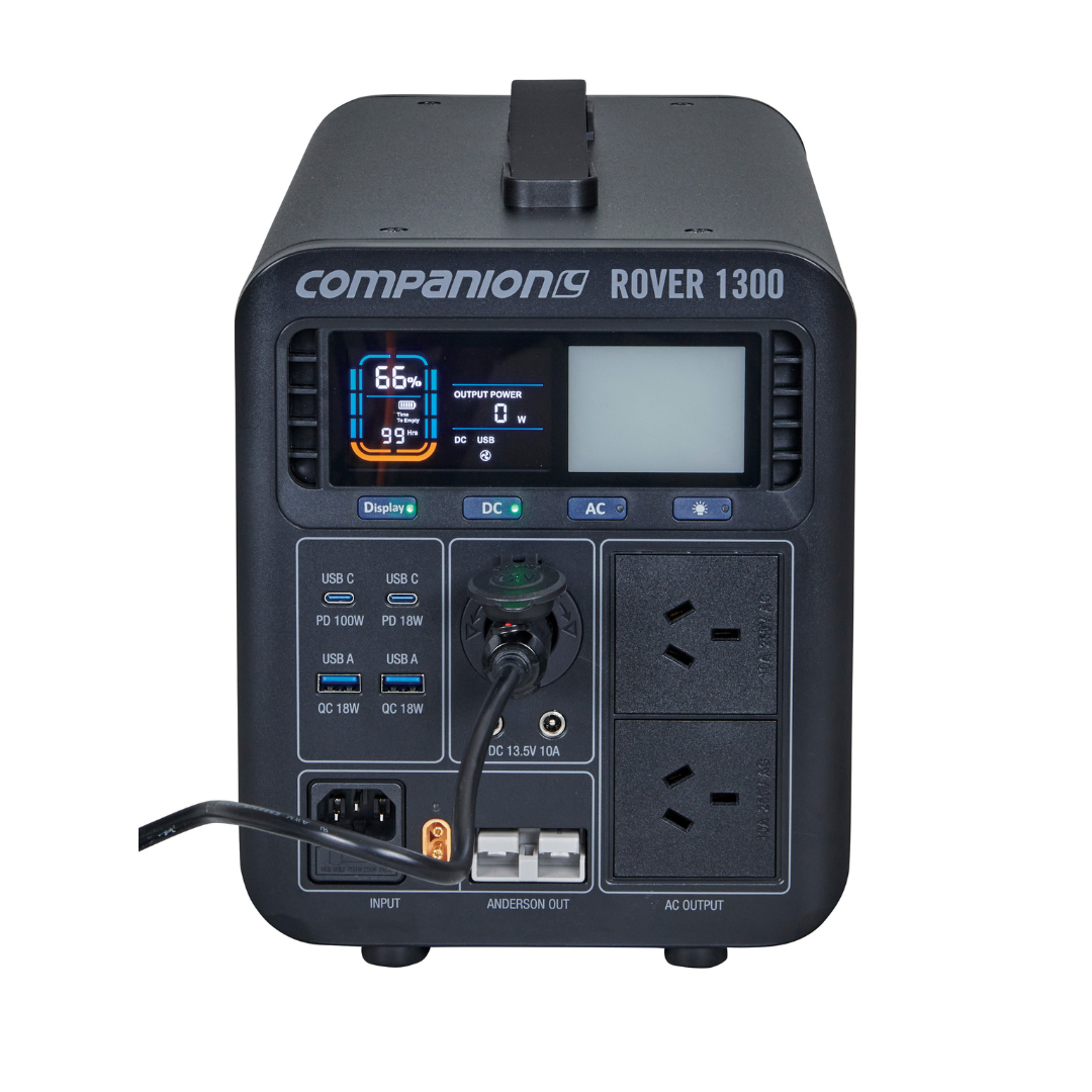 The Rover 1300w power station is Companion’s most powerful and feature packed portable power station perfect for camping and road trips. This is your ideal, portable indoor or outdoor power solution and is capable of following you anywhere you need fast, reliable power and lots of it! Powered by a lithium LiFePo4 battery, the Rover 1300 delivers an enormous 1344Wh or 105Ah (@12.8V). With a total of 10 outputs including Anderson and 2 independent AC ports, you can power almost any device and multiple devices at the same time.
