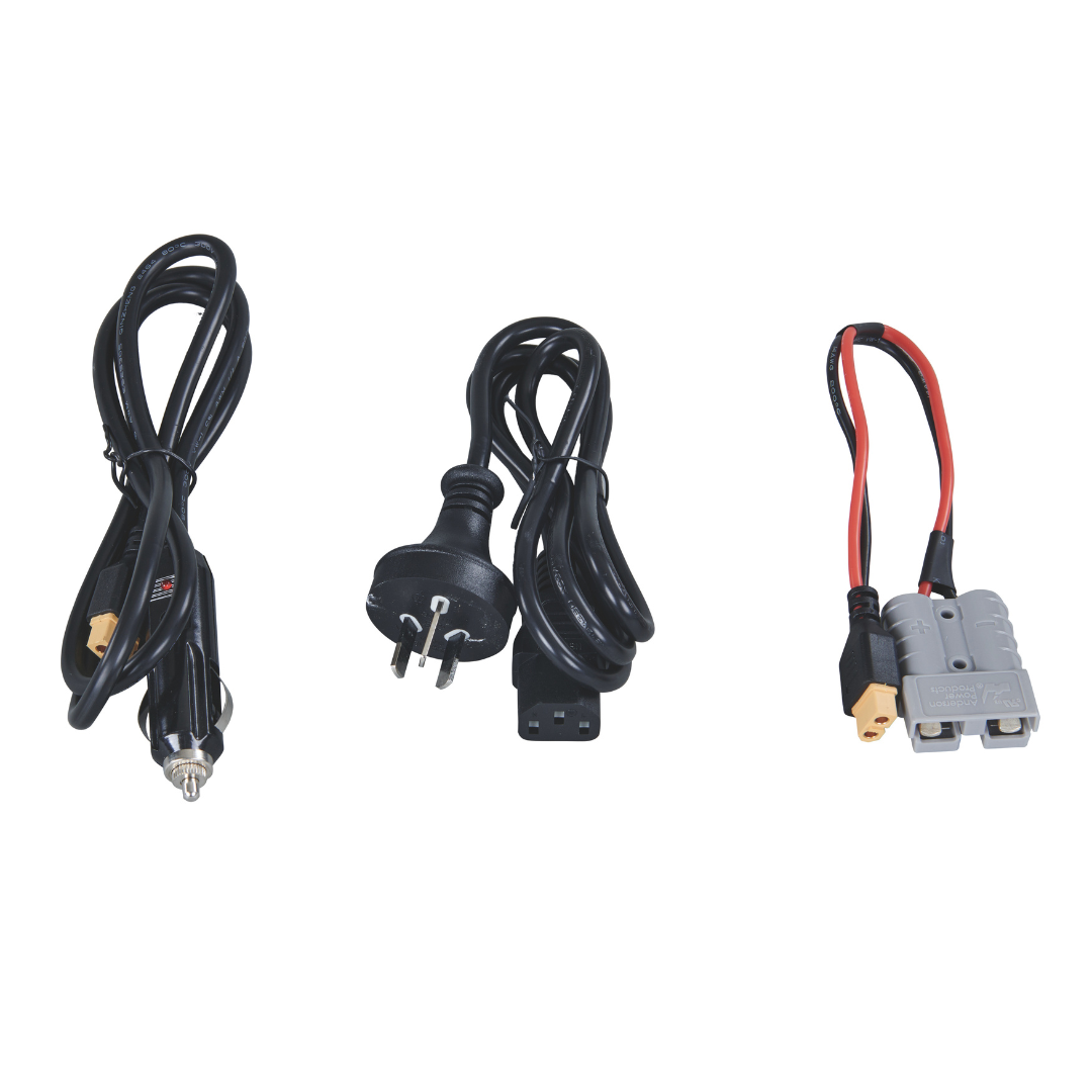 - 3 charging methods: 240V AC wall charger, 12V DC car charger, Anderson to XT60 solar charger (input/output)